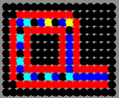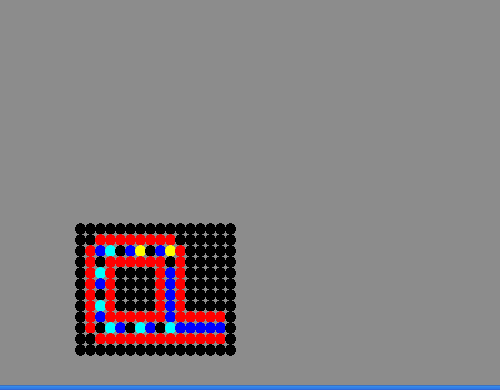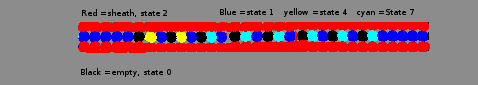 0 Background Black Empty, quiescent, 'vacuum' state. 1 Core Blue Fill tube & 'conduct'. 2 Sheath Red Form the boundary /container of the gene in the loop. 3 Green Support left tyrning; bonding two arms; generating new off-shoot; cap off-shoot. 4 Yellow Control left-turning & finishing a sprouted loop. 5 Pink Disconnect parent from offspring. 6 White Point to where new sprout should start; guide sprout; finish sprout growth. 7 Cyan Hold info. on straight growth of arm & offspring.