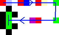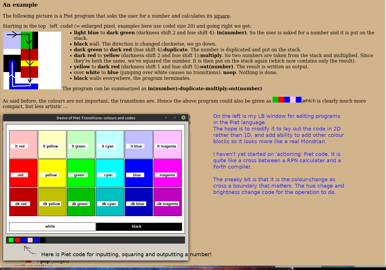 Execution starts at the top left and heads towards the right. Only 20 colours are used in Piet code, and it is the TRANSITION to the next colour that governs the operation that will be effected. For non-looping code you could stay on a single 1D line. To make it visible to human eyes, rather than individual colour pixels, we scale it up to blocks, typically 20x20, called codels. Motion is orthogonal- diagonals are not allowed.