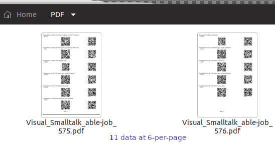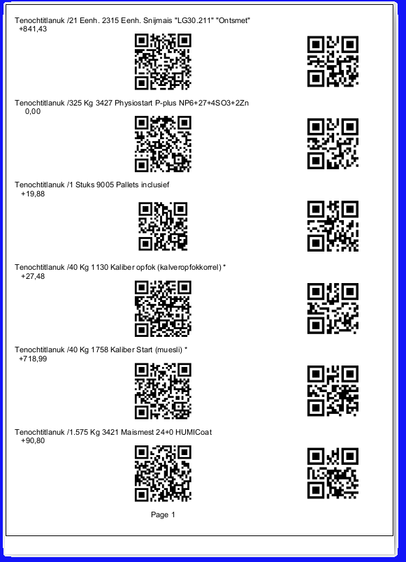 I use an online Google service to turn the data into QR codes. These are sent to a graphic page which when full prints and starts another page. I used a routine to right align currency numbers, and show with + or - signs and a comma as decimal separator. I also add a footer.