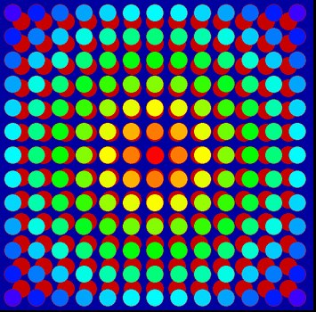 ' Assumes Linux/Wine/LB4.5 and PortableImageMagick ' in the directory this .bas file is stored. nomainwin global pi, col$: pi =3.14158265 WindowWidth =716 WindowHeight =740 open "Circle animator" for graphics_nsb as #wg #wg "trapclose quit" #wg "size 1 ; down ; fill 0 0 160 ; flush" calldll #kernel32, "Sleep", 2000 as long, ret as void #wg "backcolor 200 0 0 ; color 200 0 0" for x =50 to 650 step 50 for y =50 to 650 step 50 #wg "up ; goto "; x; " "; y #wg "down" #wg "circlefilled 20" next y next x #wg "flush" calldll #kernel32, "Sleep", 2000 as long, ret as void #wg "getbmp scr0 1 1 706 740" n =1 pi =3.14158265 t =-20 stp = 4 [around] print t, stp #wg "cls ; drawbmp scr0 0 0 ; flush" for x =50 to 650 step 50 for y =50 to 650 step 50 scan radius =int( ( ( x -350)^2 +( y -350)^2)^0.5) /30 theta =ATAN2( 350.1 -y, x -350.1) dx =t *radius /10 *cos( theta) dy =t *radius /10 *sin( theta) xx =x +dx yy =y -dy if x <350.1 and y <350.1 then xx =x -dx: yy =y +dy ' quadrant upper left if x >350.1 and y <350.1 then xx =x -dx: yy =y +dy: ' quadrant upper right if x >350.1 and y >350.1 then xx =x -dx: yy =y +dy: ' quadrant lower right if x <350.1 and y >350.1 then xx =x -dx: yy =y +dy ' quadrant lower left call hsv2rgb int( 360 *radius /20), 0.99, 0.99 ' hue, saturation, value #wg "up ; goto "; xx; " "; yy #wg "down ; backcolor "; col$ #wg "circlefilled 20" next y next x #wg "flush ; getbmp scr 1 1 710 700" bmpsave "scr", "ZZZZ" +right$( "000" +str$( n), 3) +".bmp" n =n +1 calldll #kernel32, "Sleep", 1000 as long, ret as void t =t +stp if t > 20 and stp >0 then stp =0 -stp: t =20: goto [around] if t > -20 and stp >0 then goto [around] if t > -20 and stp <0 then goto [around] 'wait calldll #kernel32, "Sleep", 2000 as long, ret as void IM$ ="convert -geometry 50%x50% -delay 50 ZZZZ*.bmp ZZZZani.gif" run "cmd.exe /c "; chr$( 34); IM$; chr$( 34), HIDE calldll #kernel32, "Sleep", 10000 as long, ret as void 'for i =1 to 10 'kill "ZZZZ" +right$( "000" +str$( i), 3) +".bmp" 'next i 'run "explorer.exe ZZZZani.gif" ' calls Wine/IE but doesn't display the gif <<<<< projectFile$ ="sampleH.html" Q$ =chr$( 34) open projectFile$ for output as #w #w "<html>" #w "<<body bgcolor=" +Q$ +"C0C080" +Q$ +">" #w "<center>" #w "<<h1>" #w "Animation output" #w "<</h1>>" #w "<mg src=" +chr$( 34) +"ZZZZani.gif" +chr$( 34) +">" #w "<p>" #w "</center>" #w "This animation was prepared, embedded in an html page and displayed in the web browser" #w "<p>" #w "<<hr>" #w "</body>" #w "</html>" close #w run "explorer.exe sampleH.html" close #wg wait sub quit h$ close #wg end end sub function ATAN2( y, x) Result$ = "Undetermined" If ( x =0) and ( y >0) then ATAN2 = pi /2: Result$ ="Determined" if ( x =0) and ( y <0) then ATAN2 =3 * pi /2: Result$ ="Determined" if ( x >0) and ( y =0) then ATAN2 =0: Result$ ="Determined" if ( x <0) and ( y =0) then ATAN2 =pi: Result$ ="Determined" If Result$ <>"Determined" then BaseAngle =ATN( abs( y) /abs( x)) If ( x >0) and ( y >0) then ATAN2 = BaseAngle If ( x <0) and ( y >0) then ATAN2 = pi -BaseAngle If ( x <0) and ( y <0) then ATAN2 = pi +BaseAngle If ( x >0) and ( y <0) then ATAN2 = 2 *pi -BaseAngle end if End Function sub hsv2rgb h, s, v ' hue 0-360, saturation 0-1, value 0-1 if h >=360 or s >1 or v >1 then call quit h$ c =v *s ' chroma h =h x =c *( 1 -abs( ( ( h /60) mod 2) -1)) m =v -c ' matching adjustment select case case h < 60 r = c: g = x: b = 0 case h <120 r = x: g = c: b = 0 case h <180 r = 0: g = c: b = x case h <240 r = 0: g = x: b = c case h <300 r = x: g = 0: b = c case else r = c: g = 0: b = x end select rd = abs( int( 256 *( r + m))) gn = abs( int( 256 *( g + m))) bu = abs( int( 256 *( b + m))) col$ =right$( " " +str$( rd), 3) +" " +right$( " " +str$( gn), 3) +" " +right$( " " +str$( bu), 3) end sub