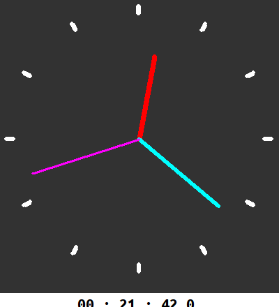 'nomainwin WindowWidth =420 WindowHeight =490 open "Analogue Clock" for graphics_nf_nsb as #wg #wg "trapclose quit" #wg "font Ubuntu_mono bold 18" i =0 gosub [bg] for seconds =0 to 86400 /2 -1 step 1 ' check every 1 second in 12 hr cycle ' 6 degrees per min/sec. 30 degrees per hour 'for seconds =21 *60 +40 to 21 *60 +44 step 1 angleSecs =( 6 *seconds) mod 360 ' second hand position in degrees angleMins =( 6 *seconds /60) mod 360 ' minute hand position in degrees angleHrs =( 12 *seconds /60 /24) mod 360 ' hour hand position in degrees #wg "cls" #wg "drawbmp scr 1 1" #wg "color darkblue ; up ; goto 100 445 ; down" #wg "\" +tme$( seconds) xH =120 *sinrad( angleHrs): yH =120 *cosrad( angleHrs) #wg "size 7 ; up ; goto 200 200 ; down ; color red ; goto "; 200 +xH ; " "; 200 -yH xM =150 *sinrad( angleMins): yM =150 *cosrad( angleMins) #wg "size 5 ; up ; goto 200 200 ; down ; color cyan ; goto "; 200 +xM ; " "; 200 -yM xS =160 *sinrad( angleSecs): yS =160 *cosrad( angleSecs) #wg "size 3 ; up ; goto 200 200 ; down ; color pink ; goto "; 200 +xS ; " "; 200 -yS nearness0 = angleBetween( angleMins, angleHrs ) ' abs( angleMins -angleHrs) nearness180 = angleBetween( angleMins, angleHrs ) -180 ' abs( angleMins -angleHrs) -180 HM120 = angleBetween( angleMins, angleHrs ) ' abs( angleMins -angleHrs) -120 SM120 = angleBetween( angleMins, angleSecs) ' abs( angleMins -angleSecs) -120 HS120 = angleBetween( angleHrs, angleSecs) ' ( abs( angleHrs -angleSecs) -120) mod 360 'print int( angleHrs), int( angleMins), int( angleSecs), int( HM120), int( SM120), int( HS120) 'if ( ( abs( HM120) <40) and ( abs( SM120) <40) and ( abs( HS120 ) <40) ) then if abs( HM120 -120) <3 and abs( SM120 -120) <3 and abs( HS120 -120) <3 then print tab( 50); tme$(seconds); " ( 120 degrees)" #wg "color black ; up ; goto 100 445 ; down" #wg "\" +tme$( seconds) seconds =seconds +360 call screenGrab i: i =i +10 end if if abs( nearness0 ) <0.045 then print tme$( seconds); " ( Parallel)" #wg "color black ; up ; goto 100 445 ; down" #wg "\" +tme$( seconds) seconds =seconds +1 call screenGrab i: i =i +10 end if if abs( nearness180) <0.045 then print tab( 25); tme$(seconds); " ( Anti-parallel)" #wg "color black ; up ; goto 100 445 ; down" #wg "\" +tme$( seconds) seconds =seconds +1 call screenGrab i: i =i +10 end if 'CallDLL #kernel32, "Sleep", 20 As ULong, ret As Void scan next seconds wait function angleBetween( i, j) if i < j then temp =i i =j j =temp end if th1 =i -j th2 =360 -i +j angleBetween =min( th1, th2) end function function tme$( tSec) hrs =int( tSec /60 /60) tSec =tSec -hrs *60 *60 mins =int( tSec /60) secs =tSec -mins *60 tme$ =" "; right$( "00" +str$( hrs), 2); " : "; right$( "00" +str$( mins), 2); " : "; using( "##.#", secs) end function function sinrad( th) sinrad =sin( th *2 *3.14159265 /360) end function function cosrad( th) cosrad =cos( th *2 *3.14159265 /360) end function sub screenGrab i #wg "flush ; getbmp scr2 1 1 400 440" bmpsave "scr2", "clockPics/pic" +right$( "000" +str$( i), 3) +".bmp" end sub sub quit h$ close #wg end end sub [bg] #wg "color white" #wg "size 6 ; fill 50 50 50" for th =0 to 360 step 30 xSi =180 *sinrad( th): ySi =180 *cosrad( th) xSj =190 *sinrad( th): ySj =190 *cosrad( th) #wg "up ; goto "; 200 +xSi; " "; 200 -ySi; " ; down ; goto "; 200 +xSj ; " "; 200 -ySj next th #wg "getbmp scr 1 1 420 420" return