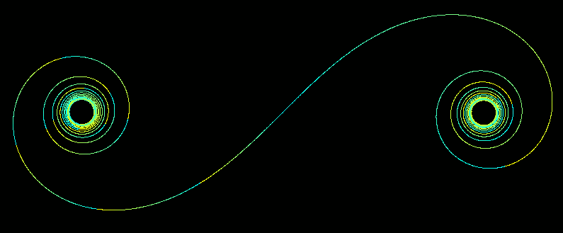 ' Cornu spiral. ' This is the trail left by a turtle which ' takes steps of a fixed size and turns right ' a linearly increasing amount each step. ' ie d( curvature) /dt =k *t ' Related to clothoid /Cornu curves/spiral. ' and also the shape of a pig's tail... ' A Euler spiral is a curve whose curvature changes ' linearly with its curve length (the curvature of ' a circular curve is equal to the reciprocal of the radius). ' NB LB's turtle accepts only integer steps and angles. ' So here I use my own turtle routines. nomainwin WindowWidth =950 WindowHeight =750 open "Curlicues" for graphics_nsb as #wg #wg "trapclose quit" #wg "down ; fill black ; flush ; size 1" global pi, TX, TY, Ttheta pi =4 *atn( 1): TX =252: TY =500: Ttheta =315 ' turtle starts at TX, TY, pointing North f = 0.0005 ' angle turned at each iteration st = 0.6 ' step size per iteration TX =452: TY =350: Ttheta =315 for i =0 to 5e3 call turn f f =f +0.4e-3 #wg "color "; str$( int( ( i mod 1024) /4)); " 255 "; str$( 255 -int( ( i mod 1024) /4)) call forward st scan next i TX =452: TY =350: Ttheta = 135 f = 0.001 for i =0 to 5e3 call turn f f =f +0.4e-3 #wg "color "; str$( i mod 256); " 255 "; str$( 255 -( i mod 256)) 'co$( i) call forward st scan next i #wg "flush" wait sub turn angle ' increment/update global turtle direction ( in DEGREES) Ttheta =( Ttheta +angle) 'mod 360 end sub sub forward s dx =s *cosRad( Ttheta) dy =s *sinRad( Ttheta) #wg "down ; line "; TX; " "; TY; " "; TX +dx; " "; TY +dy; " ; up" TX =TX +dx TY =TY +dy end sub function sinRad( a) sinRad =sin( a *pi /180) end function function cosRad( a) cosRad =cos( a *pi /180) end function function co$( I) r =int( 128 +127 *sin( I / 330000)) g =int( 128 +127 *sin( I / 170000)) b =int( 128 +127 *sin( I / 070000)) co$ =str$( r) +" " +str$( g) +" " +str$( b) end function sub quit h$ close #h$ end end sub