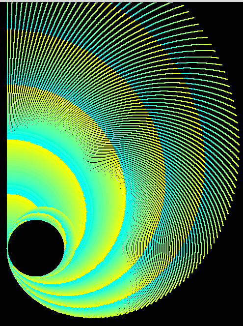 ' Circles. ' This is the trail left by a turtle which ' takes steps of a fixed size and turns rightt ' the same amount each step. ' ie d( curvature) /dt =k ' NB LB's turtle accepts only integer steps and angles. ' So here I use my own turtle routines. nomainwin WindowWidth =950 WindowHeight =750 open "Curlicues" for graphics_nsb as #wg #wg "trapclose quit" #wg "down ; fill black ; flush ; size 1" global pi, TX, TY, Ttheta pi =4 *atn( 1): TX =252: TY =500: Ttheta =270 ' turtle starts at TX, TY, pointing North f = 0.1 ' angle turned at each iteration st = 0.1 +rnd( 1) ' step size per iteration for f = 0 to 2.5 step 0.005 TX =252: TY =500: Ttheta =270 for i =0 to 1.5e3 call turn f #wg "color "; str$( int( f *3000) mod 255); " 255 "; str$( 255 -int( f *5000) mod 255) call forward st 'if i mod 2e3 =0 then ' to save for an animated GIF. ' #wg "flush" ' #wg "getbmp scr 0 0 960 710" ' bmpsave "scr", "bmp/scrJ" +str$( time$( "seconds")) +".bmp" ' #wg "cls ; drawbmp scr 0 0" 'end if scan next i next f #wg "flush" wait sub turn angle ' increment/update global turtle direction ( in DEGREES) Ttheta =( Ttheta +angle) 'mod 360 end sub sub forward s dx =s *cosRad( Ttheta) dy =s *sinRad( Ttheta) #wg "down ; line "; TX; " "; TY; " "; TX +dx; " "; TY +dy; " ; up" TX =TX +dx TY =TY +dy end sub function sinRad( a) sinRad =sin( a *pi /180) end function function cosRad( a) cosRad =cos( a *pi /180) end function function co$( I) r =int( 128 +127 *sin( I / 330000)) g =int( 128 +127 *sin( I / 170000)) b =int( 128 +127 *sin( I / 070000)) co$ =str$( r) +" " +str$( g) +" " +str$( b) end function sub quit h$ close #h$ end end sub