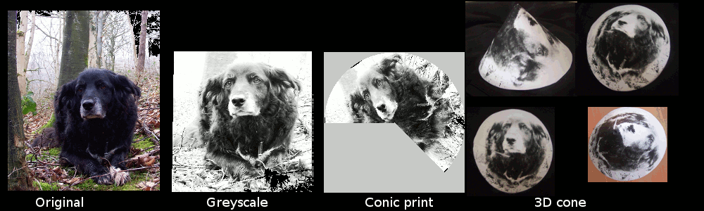 I take a suitable image, and create a grey-scale version, then re-map it so it will look correct when viewed as a 3D cone when seen face-on, and distorted by various amounts from other directions.