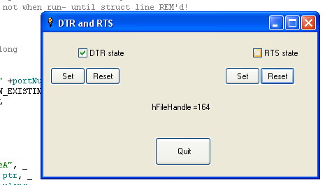 NOTE You can also use DCD & RI as inputs- search http://libertybasic.conforums.com for Rod's clear example. Thanks to him for clarifying this way to use & control the serial port pins. Note too the delays which are necessary to allow Windows to set things up.