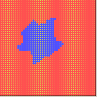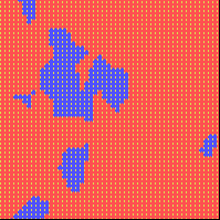 For many dimensions and large data-sets the technique becomes slowed by the many calculations! In the first animation all data points are valid- no random noise- and I choose to show the cases of red and blue neighbours being equal as Blue. In the next example I show the three regions as three colours, using magenta for the region the algorithm sees as having equal neighbours of the two types.
