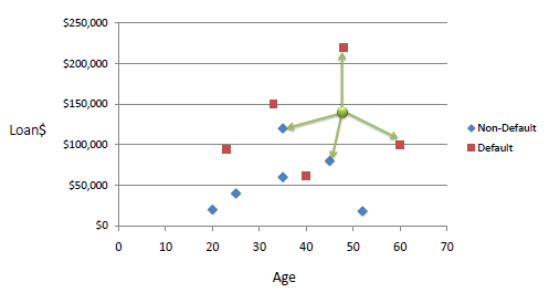 Suppose you have collected historic data in a database on something like applicants for loans. You know for each one whether they defaulted or not, and know their annual income and size of the loan. There is no calculation of risk for a new customer to end in default, but you can use the data to make an intelligent guess. Basically, look for a (small) number of previous cases- typically one to ten- that are 'nearby' in the search space, ie have nearly the same income and loan size. If the majority of them do NOT default, then you can have some confidence that your new customer will not default. Basically you are using your experience of similar cases.