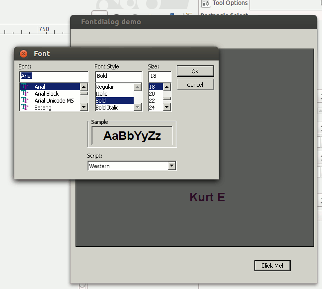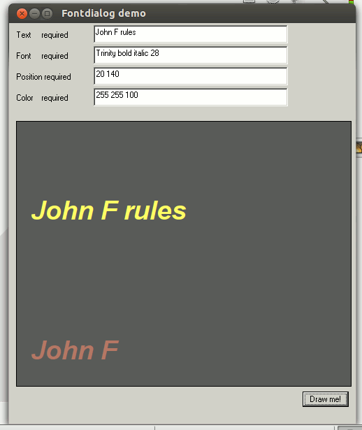 And here's an example using a user-defined way to select fonts at run-time, getting values from textboxes.nomainwin WindowWidth =504 WindowHeight =600 graphicbox #w.gb, 10, 140, 480, 380 statictext #w.st1, "", 10, 10, 110, 26 statictext #w.st2, "", 10, 40, 110, 26 statictext #w.st3, "", 10, 70, 110, 26 statictext #w.st4, "", 10, 100, 110, 26 textbox #w.tb1, 120, 2, 280, 28 textbox #w.tb2, 120, 32, 280, 28 textbox #w.tb3, 120, 62, 280, 28 textbox #w.tb4, 120, 92, 280, 28 button #w.bu1, "Draw me!", [textSpecification], LR, 50, 20 open "Fontdialog demo" for window as #w #w "trapclose [quit]" #w.gb "down ; fill 90 90 90 ; flush ; backcolor 90 90 90" ' Fill background with gray and select same gray for text's background color #w.st1 "Text required" #w.st2 "Font required" #w.st3 "Position required" #w.st4 "Color required" #w.tb1 "Kurt Eifert" #w.tb2, "Arial bold italic 28" #w.tb3, "20 240" #w.tb4 "cyan" ' or eg "240 130 60" wait [quit] close #w end [textSpecification] ' expects "text to print", "color specification", "position", "font" ' eg Type in the box "Kurt Eifert","180 80 80", "20 140", "Arial 32 bold" #w.tb1 "!contents? text$" #w.tb2 "!contents? font$" #w.tb3 "!contents? posn$" #w.tb4 "!contents? color$" #w.gb "font "; font$ #w.gb "color "; color$ #w.gb "\"; text$ #w.gb "up ; goto "; posn$; " ; down" #w.gb "flush" wait
