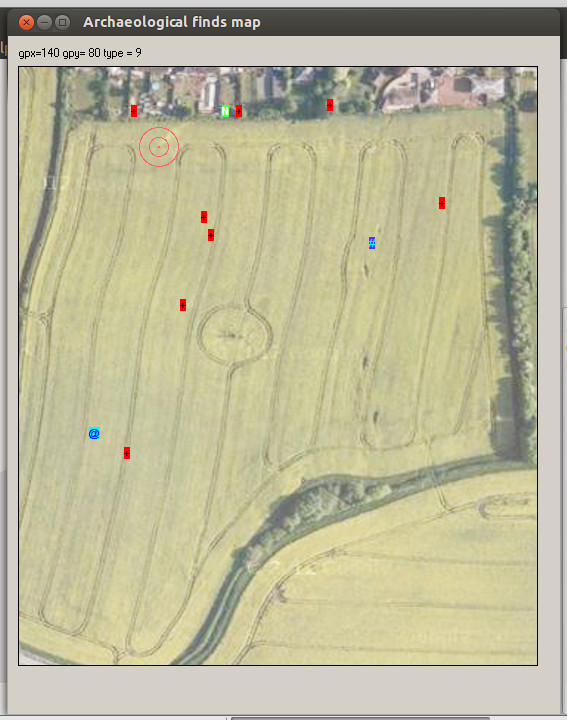 ' ++++++++++++++++++++++++++++++++++++++++ ' ++ findsMap5.bas ++ ' ++++++++++++++++++++++++++++++++++++++++ nomainwin graphicbox #demo.gb1, 10, 30, 520, 600 statictext #demo.st1, "ST", 10, 10, 600, 20 ' WindowWidth =560 WindowHeight =710 open "Archaeological finds map" for window as #demo #demo "trapclose [quit]" #demo.gb1 "down ; size 1" #demo.gb1 "font arial 8 bold" loadbmp "map", "map.bmp" #demo.gb1 "drawbmp map 0 0" #demo.gb1 "flush" timer 1000, [moveOn] wait [moveOn] timer 0 finds = 9 pwide =500 gwide =400 ' pbottom =500 gdown =450 [getData] read type, gw, gn if type =999 and gw =999 and gn =999 then wait gpx =int( ( gw -17500) * 7) gpy =int( ( gn -90620) * 2) #demo.st1, "gpx="; gpx; " gpy= "; gpy; " "; "type = "; type #demo.gb1 "place "; gpx; " "; gpy ' NB ' <<<<< There HAS to be no space before '\' in the following... select case type case 0 #demo.gb1 "color 0 0 0 ; backcolor red ;\+" case 1 #demo.gb1 "color 0 0 255 ; backcolor cyan ;\@" case 2 #demo.gb1 "color cyan ; backcolor 80 50 255 ;\#" case 9 #demo.gb1 "color 255 100 100 ; circle 1 ; circle 10 ; circle 20" case 28 #demo.gb1 "color white ; backcolor 80 255 80 ;\N" end select 'timer 200, [continue] ' <<<<< Without the delay the screen items are not drawn! 'wait '[continue] 'timer 0 goto [getData] #demo.gb1 "flush" wait ' [quit] ' close #demo ' end ' 'Uncorrected gps co-ords finds data ( type, X, Y ) '16 May 14 'AF field data DATA 0, 17516, 90644 'Thimble Pt DATA 0, 17531, 90644 'leaf DATA 0, 17544, 90641 'bullet case end DATA 28, 17529, 90644 'Naval Button front ' '31 May 14 DATA 0, 17527, 90706 'stud DATA 0, 17526, 90697 'Bottle Top DATA 0, 17523, 90741 '1d 1924 ? DATA 0, 17515, 90815 '4h r d Button DATA 0, 17560, 90690 'Button -loop ' '7 June '14 data 1, 17510, 90805 'old ZX81 computer data 2, 17550, 90710 'cigarette lighter data 9, 17520, 90660 'ring pull data 999, 999, 999 ' sentinel to show all data has been read.