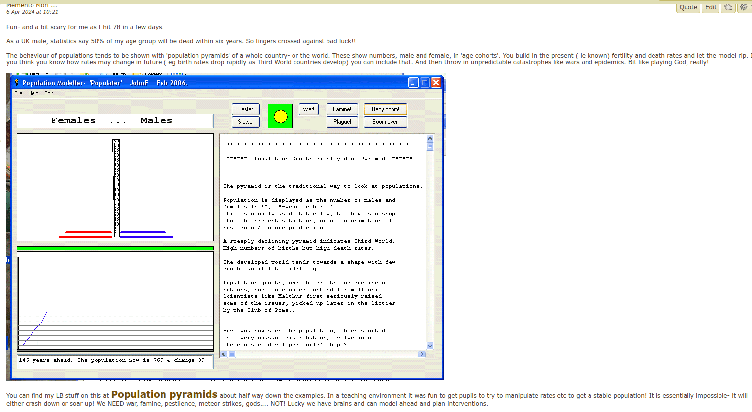 There are plenty of statistics about population. If we concentrate on birth and death rates of 'cohorts' of males and females, ie those in certain age groups, we can model how the total population changes with time. Then throw in plagues, wars etc at random. Or immigrants arriving as economic migrants, or escaping from war-torn countries. Or introduce compulsory euthanasia at ag 70. Or tax children to limit birth rates. All goo clean fun..