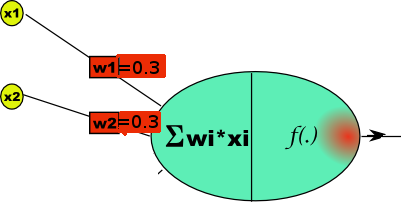 . . . . . which is indeed an AND function. No input, or only one, total 0 or 0.3 and are below 0.5 threshold. Two inputs total 0.6 and exceed it...
