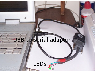 You can also drive the DTR & RTS lines Hi or Low, which gives the simplest way to control two output lines. I use as indicators two LEDs in antiparallel, and a 1k5 resistor in series between the line and earth. You can equally easily drive transistors, logic, optoisolators.....