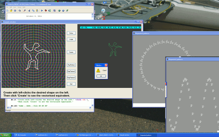 Then I realised that for more interesting shapes it woukld be stupid to draw a shape on paper and measure the distances/angles by hand. So instead I mouse-click the shape as a sries of positions on a window and derive the values from the mouse x/y coordinates. It's all a work-in-progress. There are various bits yet to implement or a bit ugly at present. I may add a marker for 'pen up' and 'pen down' to allow discontinuous shapes. Or many other ideas. And I'll be tidying up a lot before completing this webpage with a link to source LB code. But it already allows me to save any interesting shapes in a shape-library. And you can contribute your own!