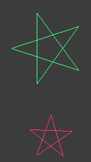 ' NB turtle commands work in DEGREES.... nomainwin WindowWidth =830: WindowHeight =650 graphicbox #w.gb, 10, 10, 800, 600 open "Display" for window as #w #w "trapclose [quit]" shape$ ="10, 1, 144, 1, 144, 1, 144, 1, 144, 1, 144, 1, 144" ' pentangle #w.gb "home ; down ; fill 60 60 60" radius =240: side =20 call display shape$, 100, " 50 255 120", 500, 300, 0 ' here, a single call. Easily repeatedly called by program. call display shape$, 60, "255 50 120", 500, 400, 20 wait [quit] close #w end sub display shape$, scale, col$, x, y, angle noOfTerms =val( word$( shape$, 1, ",")) #w.gb "color "; col$ #w.gb "up ; goto "; x; " "; y; " ; down ; size 1" #w.gb "north ; turn "; angle for i =1 to noOfTerms step 2 vStep =val( word$( shape$, i +1, ",")) vAngle =val( word$( shape$, i +2, ",")) #w.gb "go "; vStep *scale #w.gb "turn "; vAngle print "go "; vStep *100; " ; turn "; vAngle next i end sub