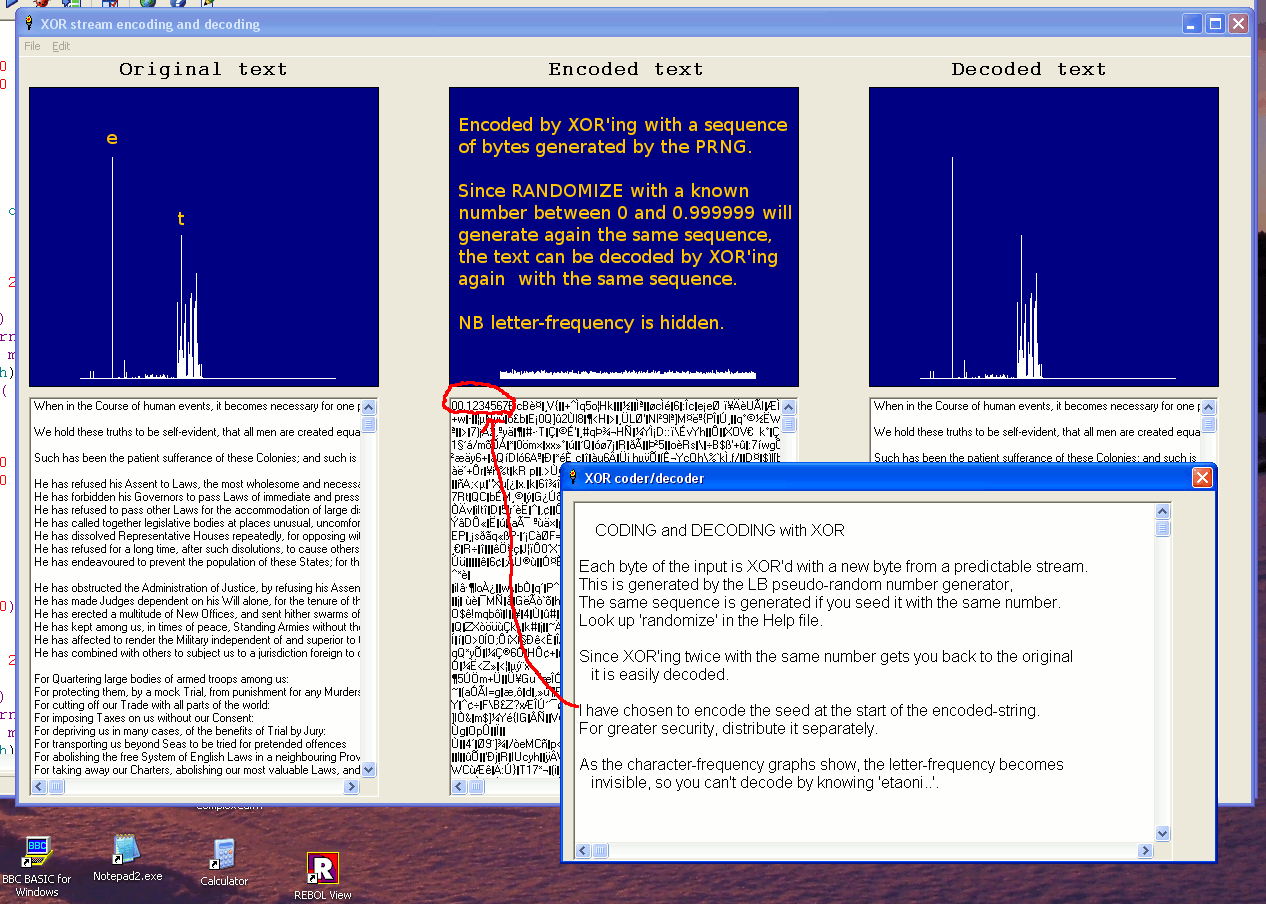 A much harder code to break is to XOR every character with a DIFFERENT byte. This scrambles each letter to some ASCII code, but can only be decoded if you know the correct SEQUENCE of coding bytes. It has the side effect of spreading the letter frequency so all characters appear on average equally often.